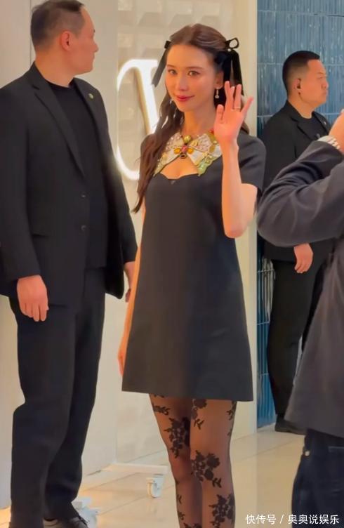 说白了就是风格打架,大波浪卷发配性感镂空裙,本已形成统一的成熟风格,结果硬生生往头上加了少女感的蝴蝶结发饰,底下又是黑丝高跟,甜美、性感、优雅三种路子想一块儿走,最终却没能形成和谐的整体